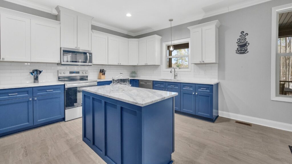 This kitchen renovation pairs crisp white upper cabinetry with deep blue lower cabinets and island millwork for a clean, high-contrast finish. Marble-look countertops, white subway tile, and light tile flooring keep the space bright and balanced, while the central island adds both prep space and everyday function.