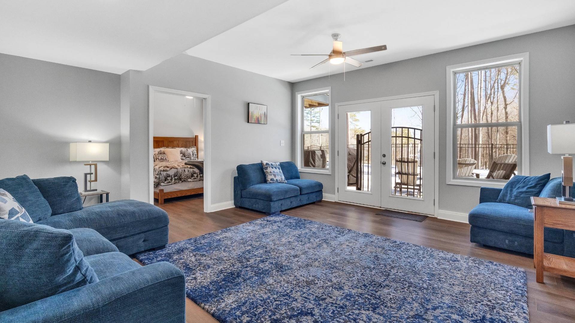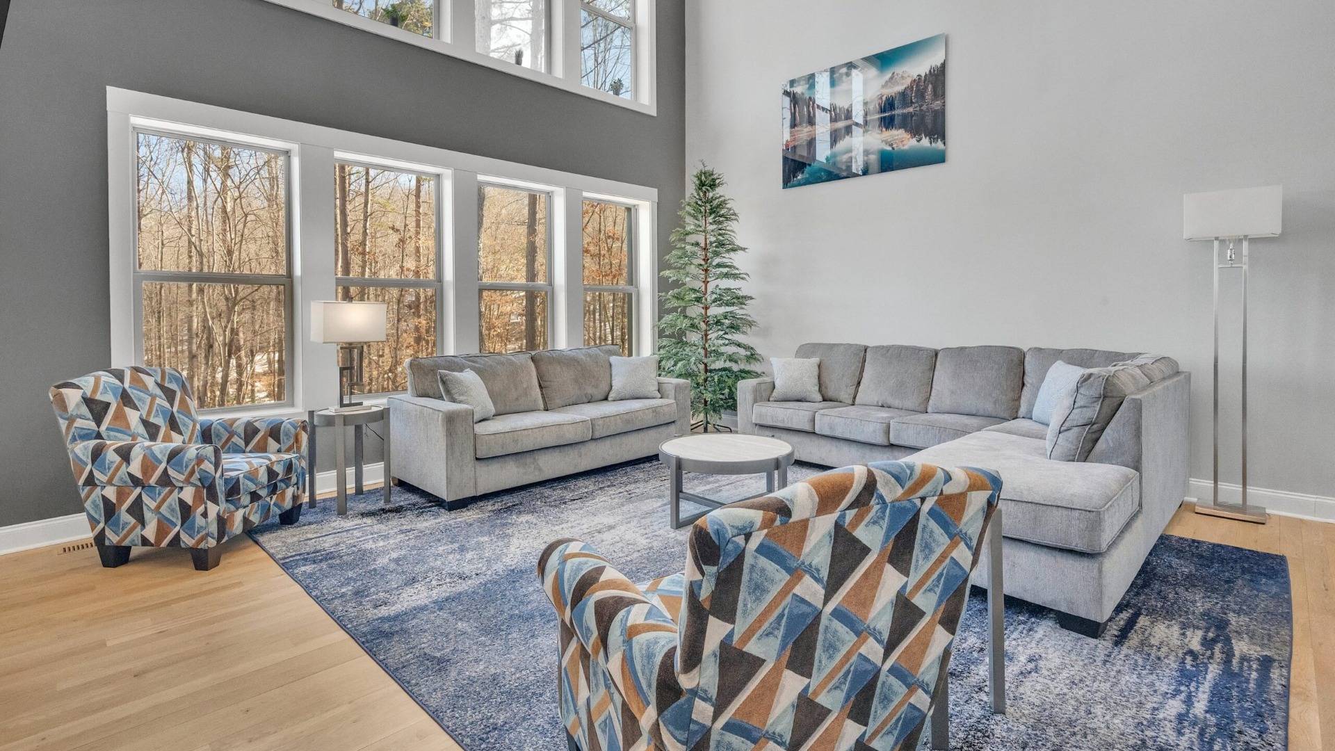 This interior renovation creates a brighter, more inviting living area with tall windows, soft gray walls, and warm wood flooring.